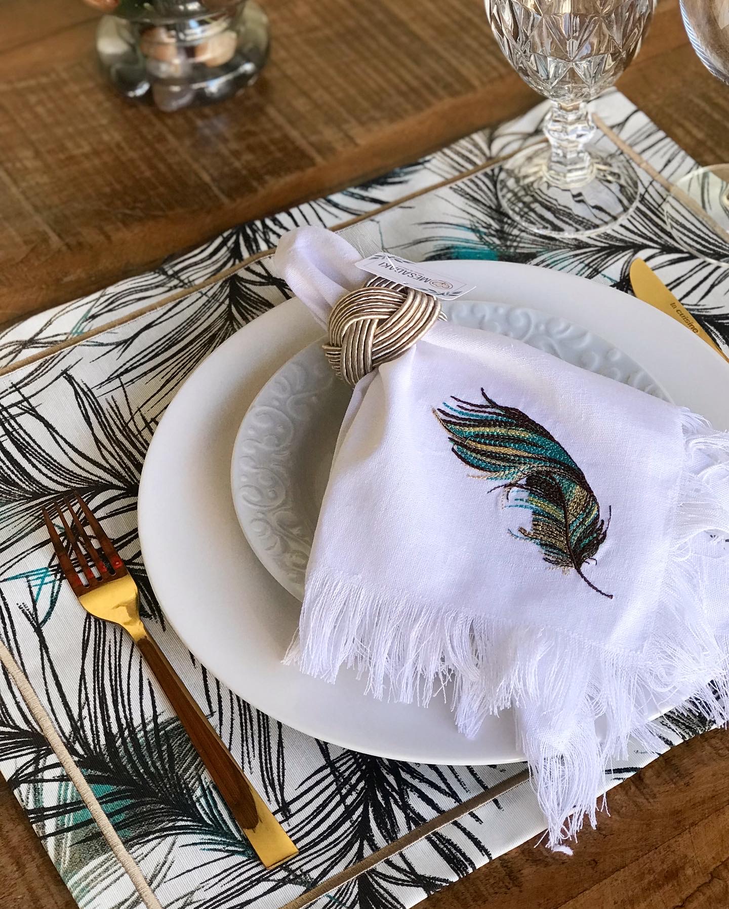 • 02 Guardanapos BORDADO COM ESTAMPA PENA DE PAVÃO. • Medidas aproximadas: 42cm x 42cm. • Permite ótima absorção. • Produzido no Brasil. • Produto artesanal. • Composição: Linho. •Franjinha desfiada nas bordas.