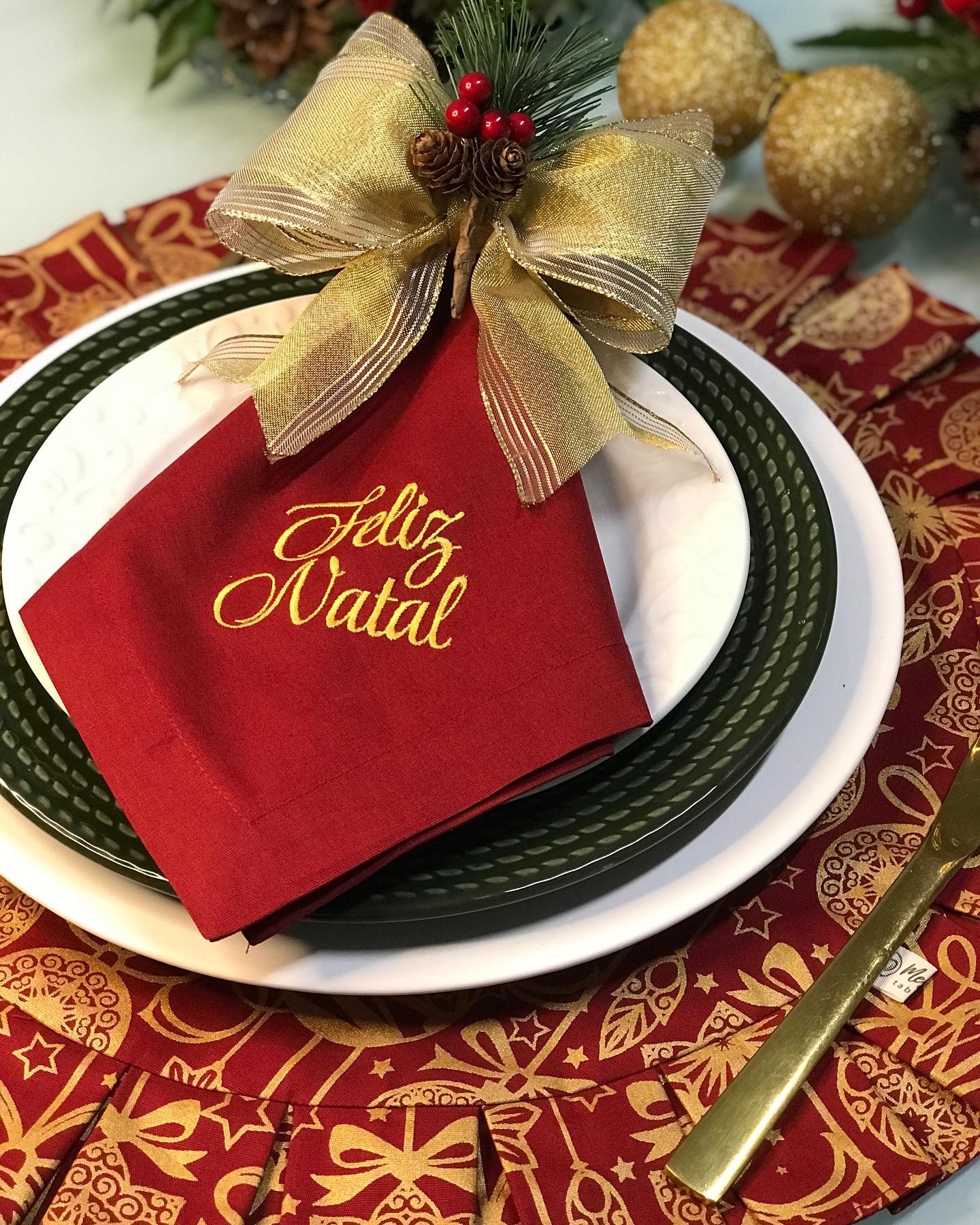• 02 Guardanapos. • Medidas aproximadas: 42cm x 42cm. • Produzido no Brasil. • Produto artesanal. • Composição: 100% algodão. Bordado: FELIZ NATAL