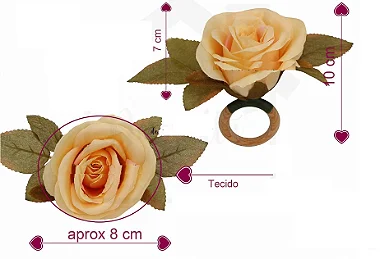 • 2 unidades de Porta Guardanapo. • Fabricação Própria. • Fabricado no Brasil. Medidas aproximadas: 7cm x 7cm x 10cm. • Material da argola: Madeira. • Material da flor: tecido. • Combinação de Cores: pink / branco